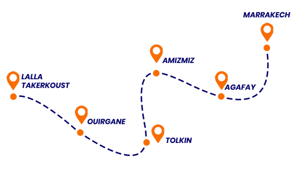 - Après-midi : poursuite du raid vers Ouirgane en empruntant les pistes sauvages et techniques du Haut Atlas.